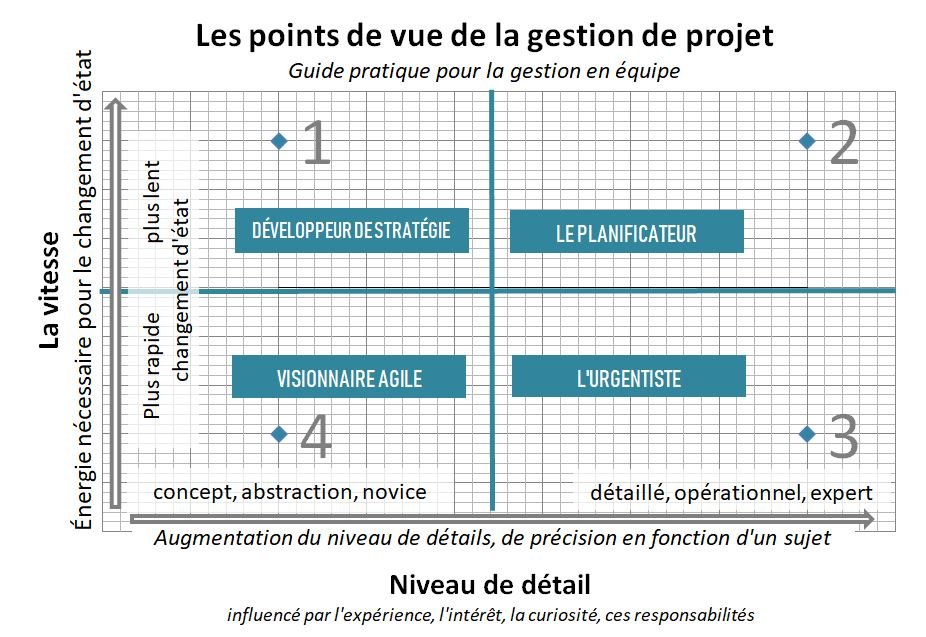 J’ai identifié deux axes fondamentaux de la gestion de projet : le niveau de détail et la vitesse. Le niveau de détail varie en fonction de notre connaissance et de notre expertise, tandis que la vitesse concerne notre capacité à changer d’état rapidement.